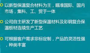公司是一家瞄準(zhǔn)國際、國內(nèi)市場,集科、工、貿(mào)于一體的綜合性公司,擁有各類先進(jìn)的設(shè)備100余臺(tái)(套),公司自主研發(fā)了新型保溫材料及彩鋼復(fù)合保溫板材連續(xù)生產(chǎn)工藝,建成了機(jī)上一次成型彩鋼復(fù)合保溫板材的生產(chǎn)線...
